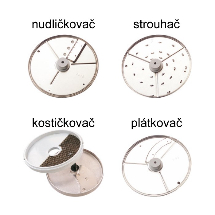- zpracovává syrovou zeleninu, ovoce a na speciálních discích ořechy, parmezán, strouhanku, čokoládu, brambory, křen a mrkev