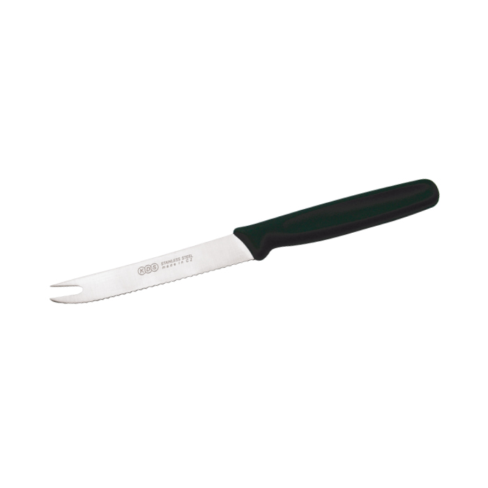 Hroty na špičce čepele mohou plnit funkci vidličky - nůž tak umožní hygienické přenášení potraviny bez dotyku ruky.