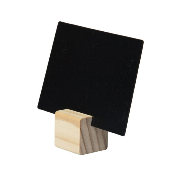 Jednoduché dřevěné stojánky kostkového tvaru s drážkou pro upevnění tabulek TAG nebo jiných informací. Jsou vyrobeny z masivního povrchově upraveného dřeva. Sada 6 kusů s tabulkami a popisovačem.